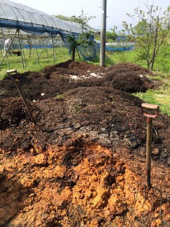 毎年この時期恒例の搾りかす運搬作業をしました。1年分のぶどうやリンゴやラ・フランスの搾ったかすを堆肥として畑に撒きます。今日はギリッと暑い日でハウスの中ということもあり、痩せるには丁度良い作業でした。