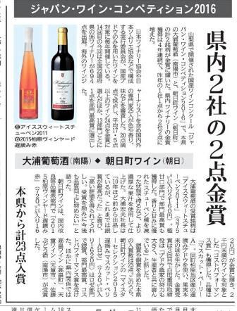 今日の山形新聞に日本ワインコンクール2016の記事が載りました。今回金賞と部門最高賞を受賞した『アイススウィートスチューベン』も紹介されています。