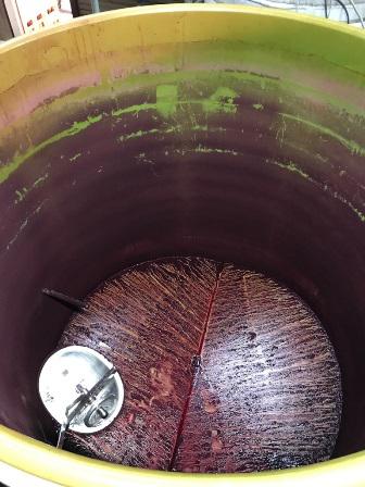 今年仕込んだワインを、品種ごとに順次澱引きをしてます。上澄みを違うタンクへ移して澱を取り除き貯蔵します。ベーリー・アリカントAのタンクですが、着色が物凄いぶどうなので酒石や澱がタンクへガッチリへばりついてます。