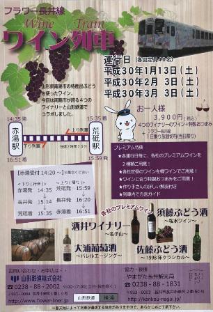 赤湯4ワイナリーのワインが飲み比べが出来るワイン列車が1月13日(土)、2月3日(土)、3月3日(土)の計3回運行致します。ワイン飲み比べの他に、おつまみと当日限りの乗り放題切符も付いてお一人様3,900円です。