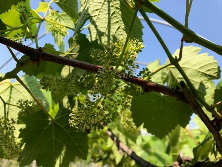 露地デラウェアの花が満開を迎えています。ぶどうの花は線香花火のようにきれいに咲きます。