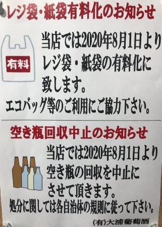 一ヶ月遅れて8月1日からになりますが、当ワインショップもレジ袋を有料化に致します。合わせて、今まで古瓶も回収しておりましたが、8月1日より中止に致します。何卒ご了承下さいませ。