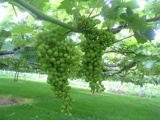上山では、うちのブドウを作って頂いている農家の方の畑を視察。画像は今現在のカベルネ・ソーヴィニヨン種。まだ幼実で色も緑だげんと、これから実が成長し、赤ワイン用の品種なので色も黒くなっていきます。
