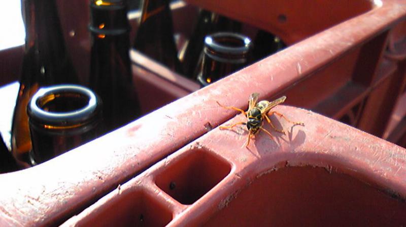 瓶を洗う為、倉庫から持ってきたP箱(一升瓶用のケース)にハチが一匹。死んでだんでねぇがぇ、と思って触ってみたら触角や足をグングン動かしてました。