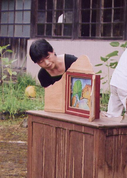 建物はもう閉校になった学校でした。入口には、やはり身動き一つしない動物が座っていました。それはまちがいなく、本物のキツネでした。車を近づけても、キツネはリンとして真すぐ前を見たまま座っています。