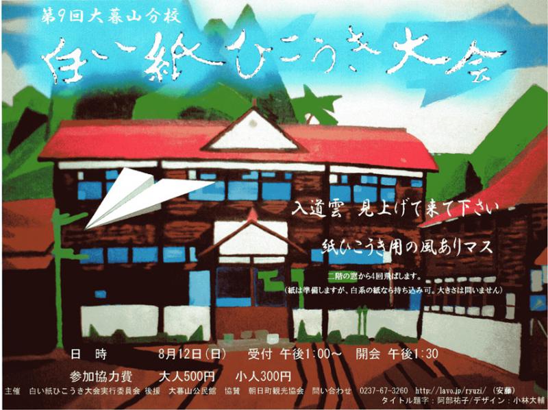9回大会(8/12)のポスターは、小学生の頃から大会スタッフをしてくれている小林大輔君(東北芸術工科大学立体造形1年)が作ってくれました。中学生の時に描いていた校舎の絵をベースにしたもので、ソフトなタッチとカラフルさが校舎の持っている優しい雰囲気を的確に表しています。額に飾っておきたくなるようなポスターになりました。キャッチフレーズ「入道雲 見上げて来て下さい。紙ひこうき用の風ありマス」は、彼の父 俊浩さんが考えて下さったそうです。