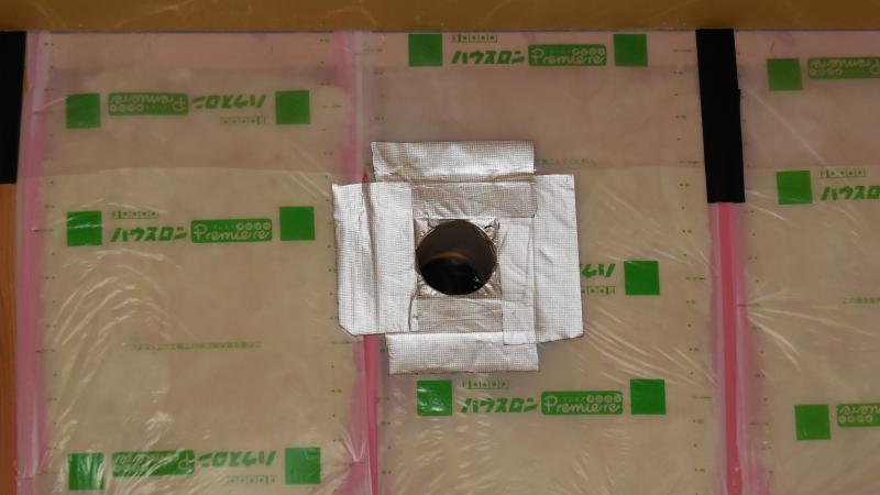 給気口の壁貫通部のテープ処理の様子です、ここを
