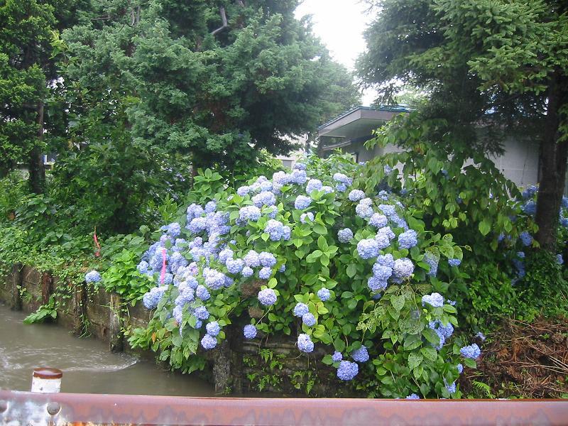 小さな川に面して立っているのですが、その川のほとりに紫陽花が咲いています。