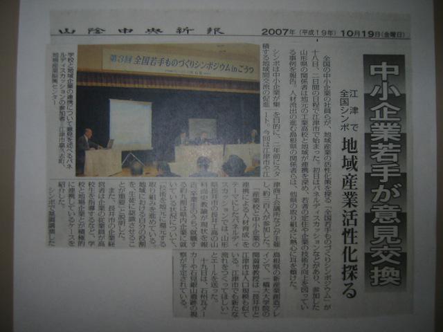◎ 写真は山陰中央新報にのったシンポジウムの様子。長井からは長井工業の山科先生、西置賜工業会の吉田会長がパネラーとして登場。写真にでています。すごいね。