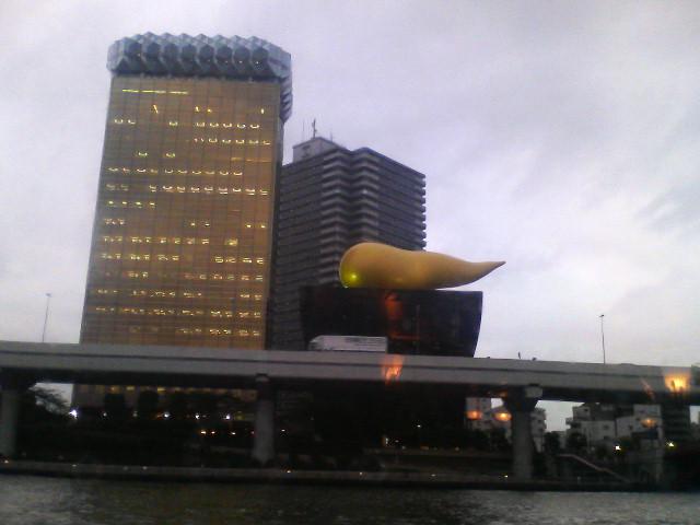 ◎ 写真は川の高さから見た「う○こビル」もとい、「炎のオブジェ」です。