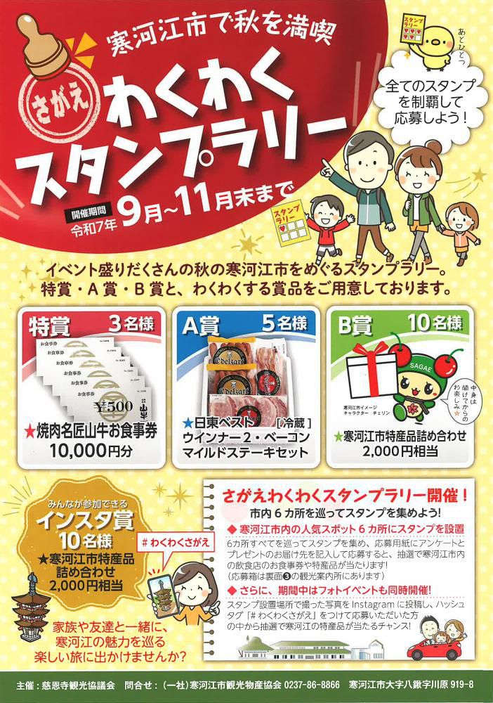 2025年の秋、山形県寒河江市で「さがえ わくわくスタンプラリー」が開催されます!市内のスポットを巡りながらスタンプを集めると、抽選で豪華賞品が当たるチャンスです。さらに、Instagramへの投稿で特産品が当たるWチャンスも! ご家族やご友人と一緒に、実り豊かな秋の寒河江へお出かけしませんか?