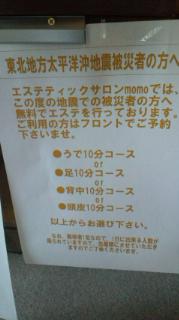 momoでも短い時間ですが、被災地からのお客様に無料で、足マッサージ10分か腕マッサージ10分か背中マッサージ10分か頭皮10分をどれかお選び頂きマッサージします。