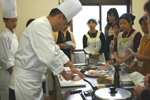 真剣にシェフの手元を見る受講生たちです。