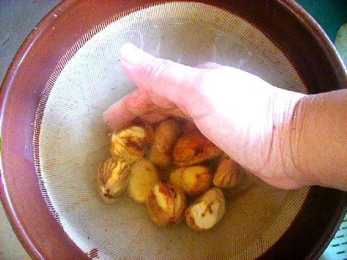 ・すり鉢の側面にこすり付けるようにして手の中でくるくると栗をころがす。