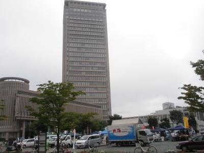 霞城セントラルを見上げる広場には、県内各地から野菜や果物、漬物、パンなどなどいろんな産物がテントを張っています。