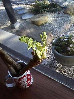 先日お邪魔した市内の喫茶店で、たらの芽の水耕栽培をしていました。
