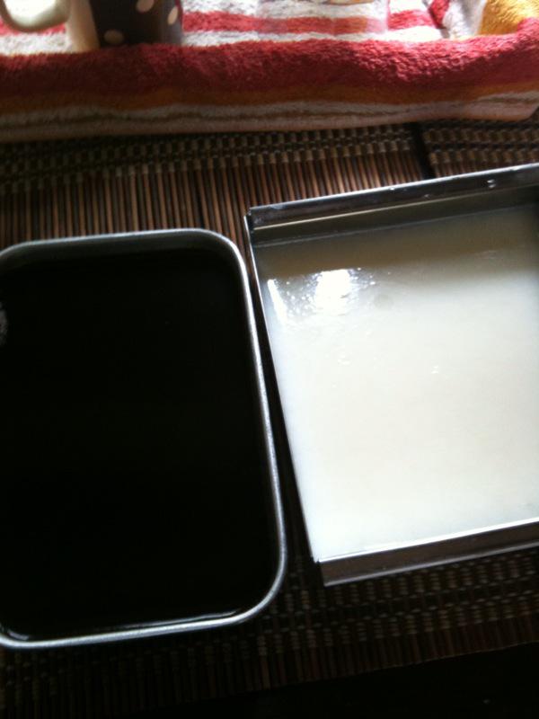 弁当箱にコーヒーゼリーと牛乳寒天を作ったけど、コーヒーゼリーは失