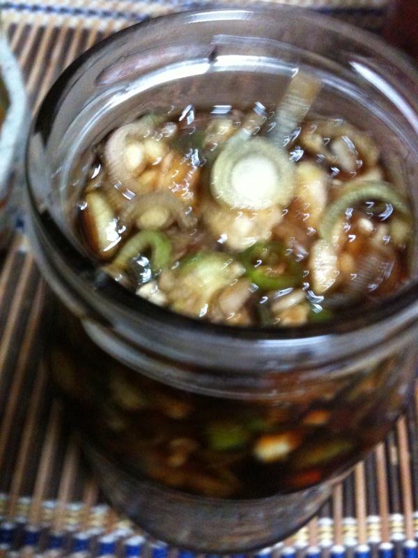 青南蛮とみょうがを切ってビンにぎっしり詰めて醤油をヒタヒタに入れて