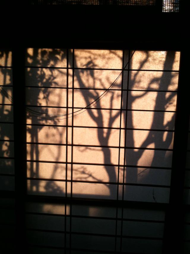 朝日があたって障子に庭木の影が写っている。