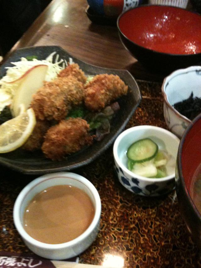 お昼は駅ビルの中でカキフライ定食。