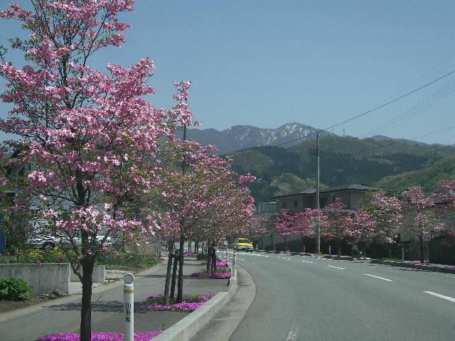 myhomeの前の道は、西蔵王に続きます。今、ハナミズキ並木が元気なピンクの花を咲かせています。蔵王連峰を背に足下はこれまた元気なピンクのシバザクラ。坂をのぼると月山、葉山、朝日連峰の山々。。。