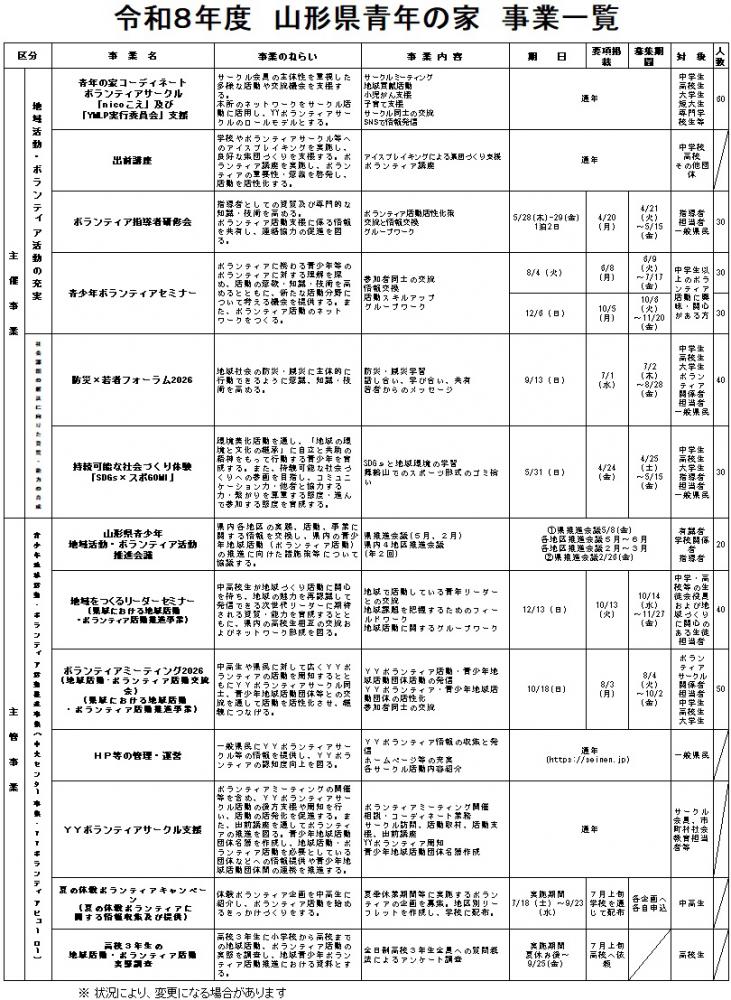 青年の家では、「青少年ボランティアの育成・支援」だけにとどまらず、「青少年による地域活動の支援」および「青少年に関わる現代的課題への対応」に関するさまざまな主催事業を予定しております。