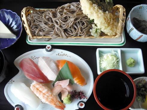 冷たい天ぷらそばと、生寿司のセットになっています。