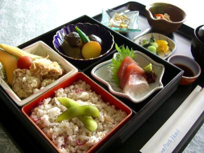 中身は、鶏のから揚げ・ナスの田楽・お刺身と、ご飯は梅しらすご飯。