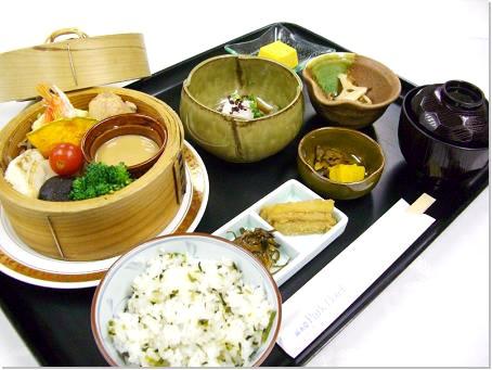 中身は 七目せいろ蒸し(海老や鶏肉、野菜各種、蟹と豆腐のふんわりむし)