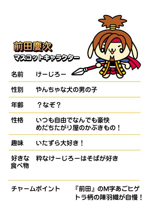 米沢市『前田慶次』マスコットキャラクターとして、2月14日の上杉雪灯篭まつりの会場でお披露目しました。そして、戦国の杜では【かねたん&けーじろー】をマスコットキャラクターとして展開します。