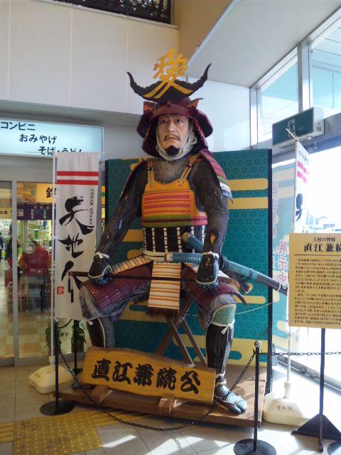 米沢駅の改札出てスグにお座りいただいてる直江兼続さんです。