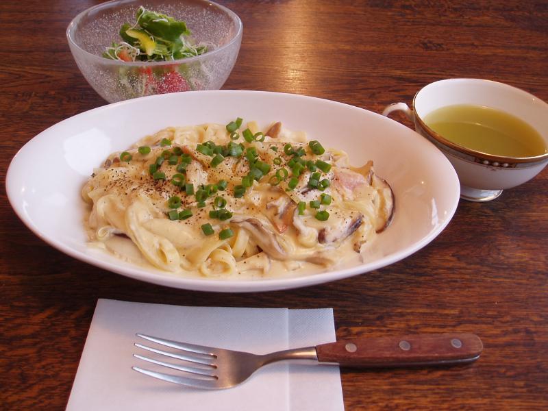 カルボナーラといえば濃厚な味覚。抹茶コンソメスープ付きで