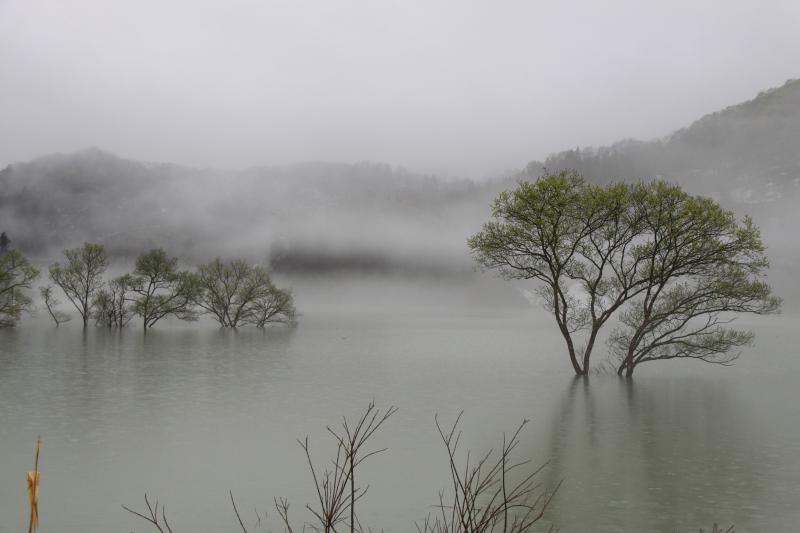 夕暮れが近づいたら急に湖面に靄が漂い始めました。