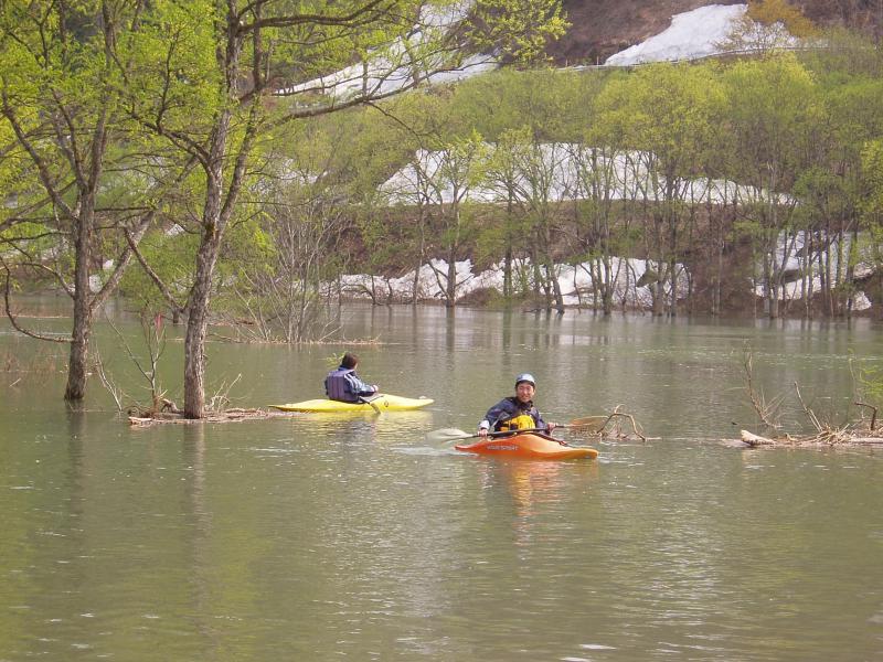 満水となった白川湖の新緑の中をスイスイとアメンボウのように