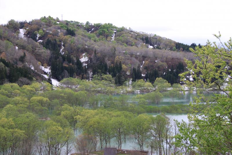 白川湖の水面から柳の木が顔を出す光景は、他ではなかなか見られません。新緑が一段ときれいな時期を迎えました。湖面の色合いもその日の天候で青くなったり緑に変わったり、毎日違った景色になります。