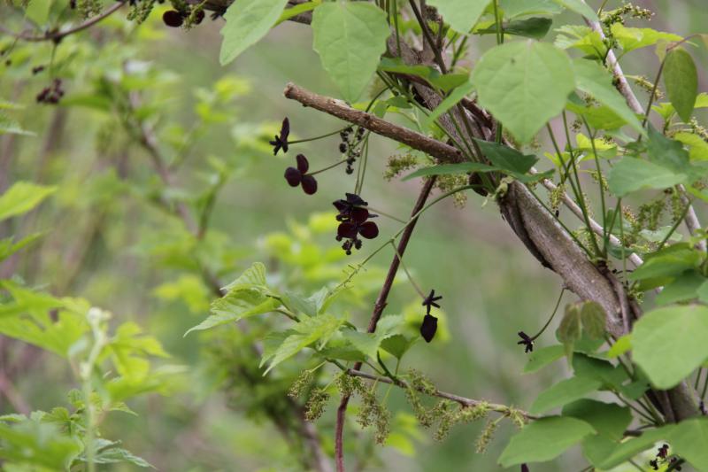 久し振りの雨の朝です。日中は晴れの予報なので、今日もパークゴルフで賑わいそうです。ここ白川湖パークゴルフ場内には様々な植物が自生しています。昨日アケビの花を見つけました。目立たず、お世辞にも綺麗な花とは言えませんが、良く見るとどこか愛嬌のある花です。