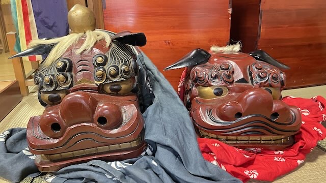 一対の獅子頭は朝日町松原で見た獅子頭の作風に似て、大きめの獅子の脳天には如意宝珠が付いて