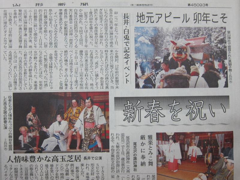 1月3日の山形新聞朝刊に 白兎地区 うさぎ年記念イベントが載りましたよ。