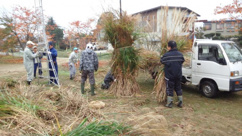 高さ 約5mの 柱に 刈ったカヤを まいていき 段々と大きくして行きます。