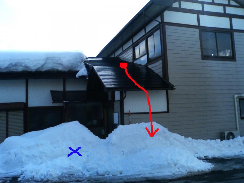 画像矢印は4年前に雪下しをしたときに当大会組織委員長が雪と一緒に落下→着地したポイントです。