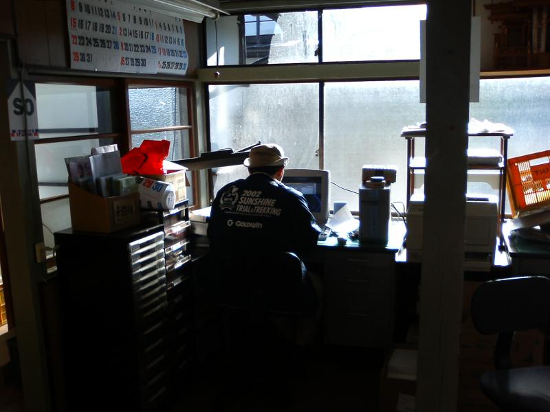 強い西日が差し込む中で選手の受付打込をする松田さん。
