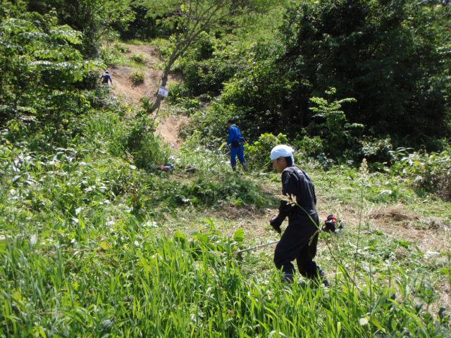 いつもは事務的作業にあたっている事務局男性陣も、日頃のうっぷんを晴らす勢いで刈り払い機を操作しています。