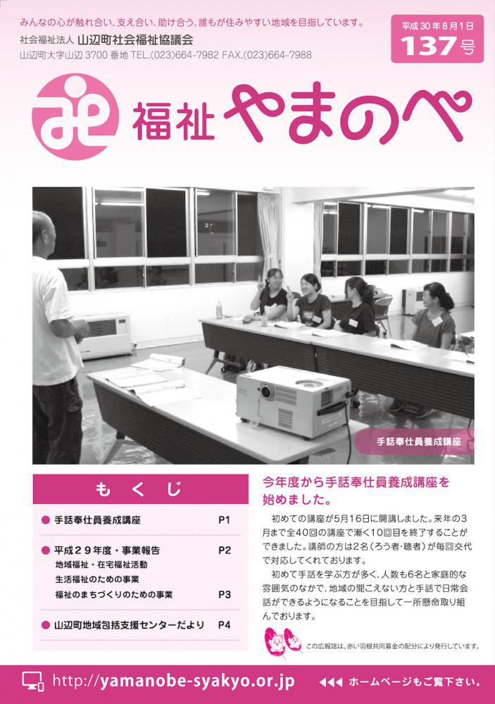 山辺町社会福祉協議会・広報誌「福祉やまのべ」137号H29年度の山辺町社会福祉協議会の事業報告について、活動内容と収支内訳について掲載しております。また、今年度から始めた手話奉仕員養成講座、「いきいき100歳体操」についての地域包括支援センターだよりもご覧下さい。http://yamanobe-syakyo.or.jp/