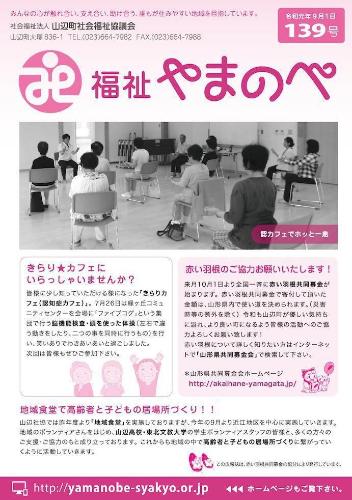 山辺町社会福祉協議会・広報誌「福祉やまのべ」139号きらり★カフェの様子や、昨年度より行っている地域食堂について、新年度の役員体制や平成30年度事業報告、地域包括支援センターからのお知らせなど盛り沢山の内容になっております。赤い羽根募金も10月1日から始まりますので皆様のご協力をよろしくお願いいたします。http://yamanobe-syakyo.or.jp/