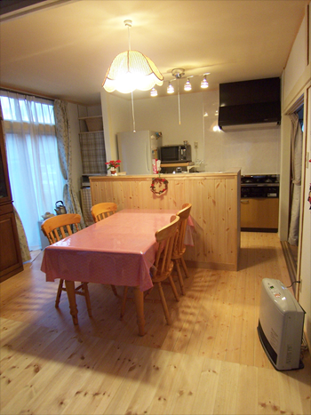 床もキッチンカウンターもパイン(米松)で統一したことで、よりいっそうの統一感がでています。