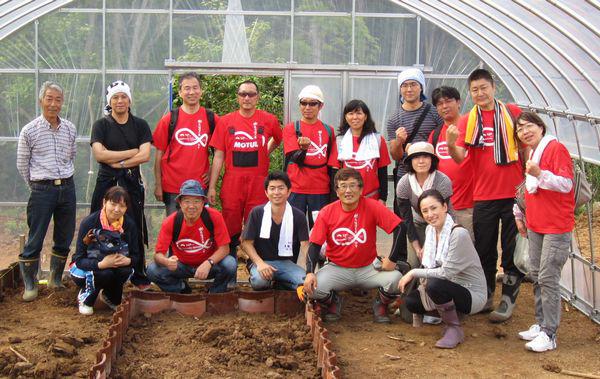粘土状の土をツルハシで掘り起こし丹念に整地作業