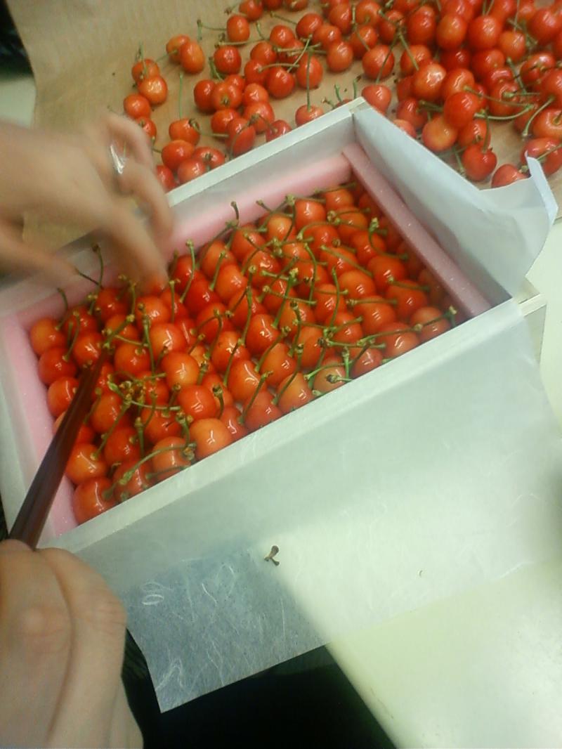 明日、25日午後1時55分からTBS系列の全国ネットで放映される、「えなりかずき!そらなび」という番組でVTR取材した、当農園の様子が紹介されますが、スタジオでえなりかずきやスタッフが実際にさくらんぼを食べてみたいということなので、急遽、収穫し桐箱に詰めたところです。色合いや味的にもまだまだですので、本当の意味での間に合わせになってしまいました。