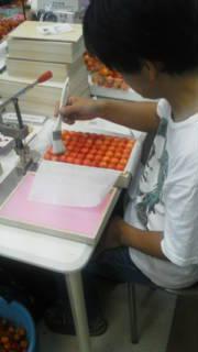 桐箱にさくらんぼを詰めるときは、底蓋を外し、逆さ詰めにします。仕上がった後に、底蓋を釘打ちし、上蓋を取って点検します。吉岡君は、詰め方作業をしている女性の中にたった一人の男性として張り切って作業に励んでいます。一個ずつ点検して、彼のメカネにかなったものだけが出荷にはります。