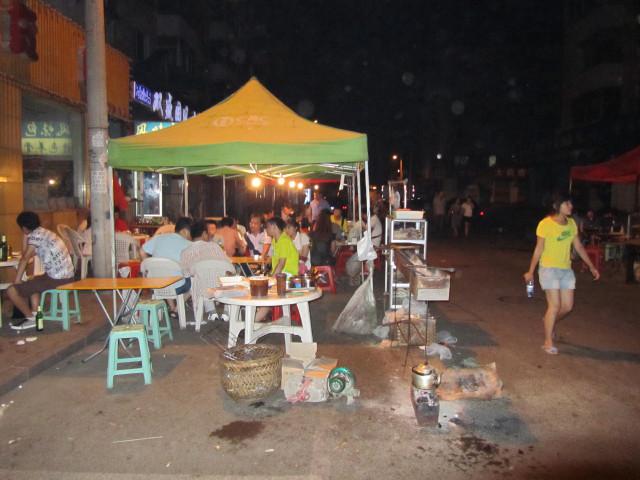 タクシーの中から電話で予約した遼寧賓館にチェックインし、ハンナ先生と相談して、清真(回族)料理を食べに出ることにしました。写真は、清真(回族)料理店の前に出された、中国のどんな街にもある屋台風の出店です。羊の串焼きと、野菜炒め、それにあまりおいしくない枝豆をつまみに生ぬるいビールを飲みました。