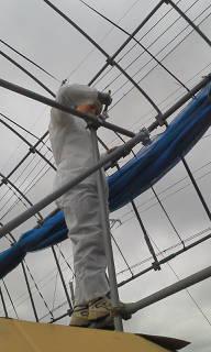 ▼雨除けパイプハウスの塗装作業中です。